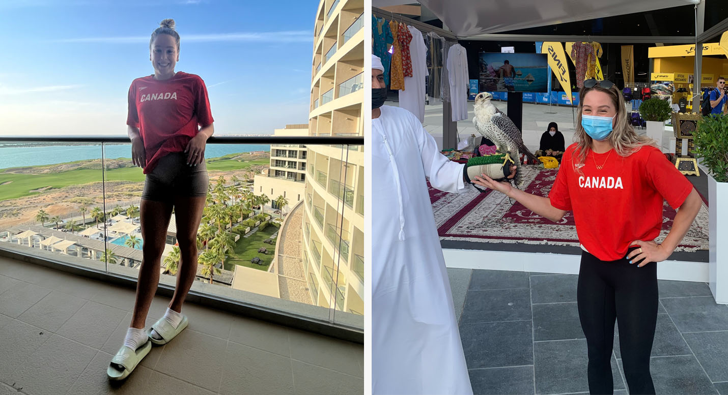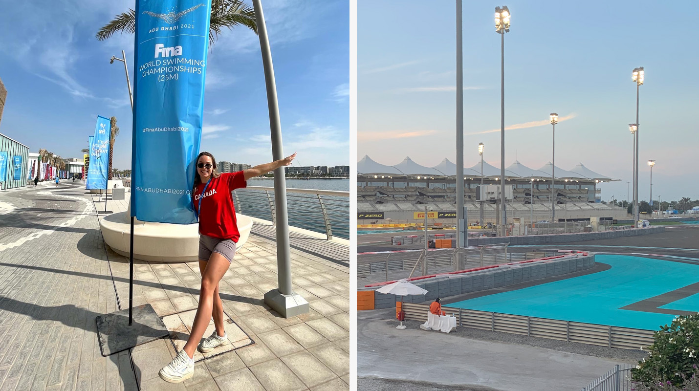 December of 2021, a few months after the Olympics, Team Canada travelled to Abu Dhabi for the World Short Course Championships, held in the Etihad Arena. The term ‘short course’ means races are swum in a 25-meter pool, rather than a ‘long course’, or 50-meter pool, similar to track with an indoor and outdoor season. The World Championships alternate each year between short and long course, allowing the best swimmers to essentially race twice as many events. The Olympics and all other international meets are swum long course, so this short course Worlds always turn out to be really fun – it’s our first opportunity to race fast short course in two years.