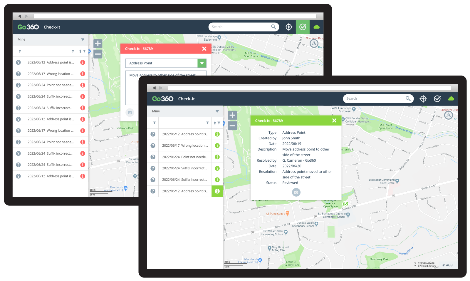 Go360™ Check-It is the easy-to-use tool for people using maps and Go360 applications to check into why their map / data is not what was expected. Users can request Go360 to check into any discrepancies, make corrections, or updates required to keep map data accurate and up to date. As users perform their regular tasks, they simply create a marker on the map, add a comment or description, and send off the request for verification by a data specialist. All with minimal disruption to their own daily tasks and workflows.