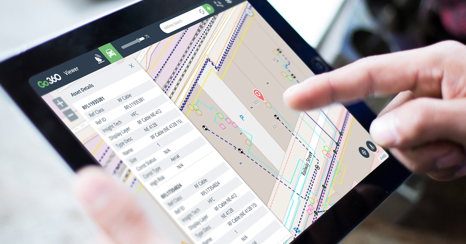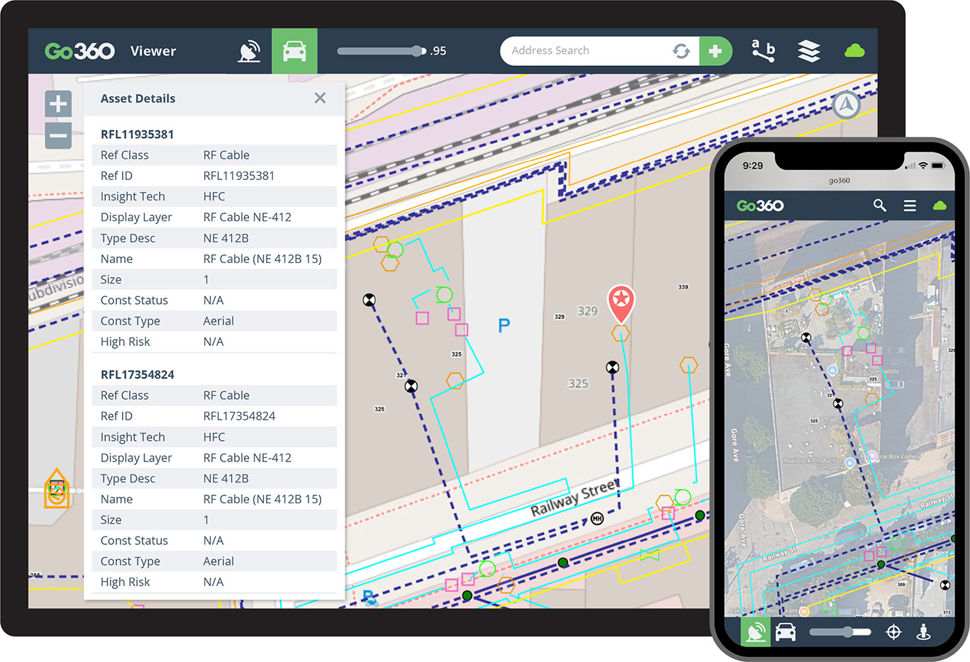 Go360™ Viewer allows users to view the system digital twin including assets and real-time network configuration. Managers and executives can view job status, and any other information required for specific departmental and reporting responsibility. View maps, addresses, structures, the network and assets along with their details. Toggle between road or satellite base maps.